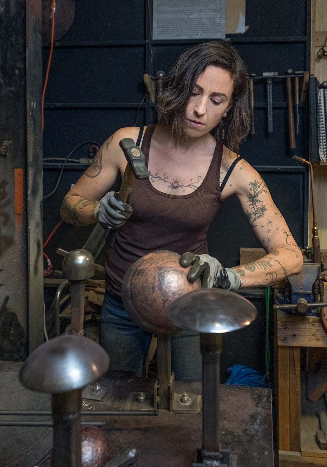 Raising metal has been used for thousands of years to create vessels, utensils and other functional objects. Sheet metal is shaped with the use of hammers and stakes. The process begins with heating non-ferrous (brass, bronze, copper, or silver) sheet metal to a point where the material becomes malleable, then cooling it down- after which it is worked with hammers and stakes in concentric circles to evenly stretch, bend and compress the metal into complex and hollow forms. Each time the hammer hits the metal, the material hardens as it stretches and bends; the crystals can only stretch so far before the metal becomes so hard that it is unworkable. In order to create depressions or hollow and complex forms with controlled contours, one must repeat the heating-cooling-working process over and over in order to get any dramatic shaping.