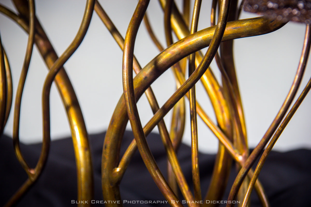 Most people are familiar with Forging, which refers to changing the shape of steel by heating, hammering and/or bending. Unlike non-ferrous metals, steel is most malleable when it is red hot, though I often use jigs to bend it into complex curves when it is cold. All of the table legs and formed stems and branches in my sculpture and furniture were done by hand.