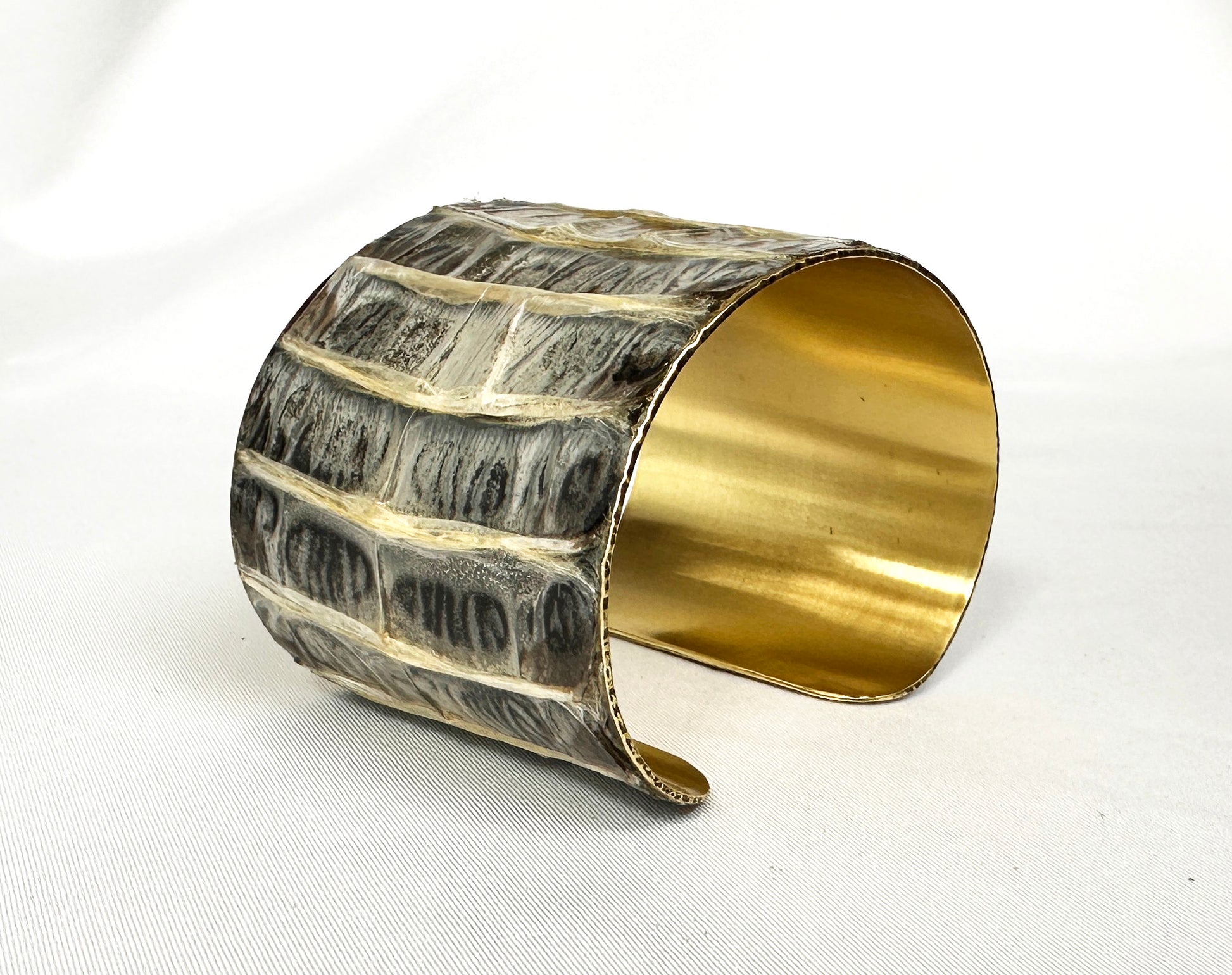 This bold design is a one of a kind hand-formed metal cuff coated in real snake shed, and is a stunning accessory that takes "earthy" style to the next level. Dress up or down- either way you'll be wearing an adornment that will turn heads, start conversations, and delight the eye of the beholder.