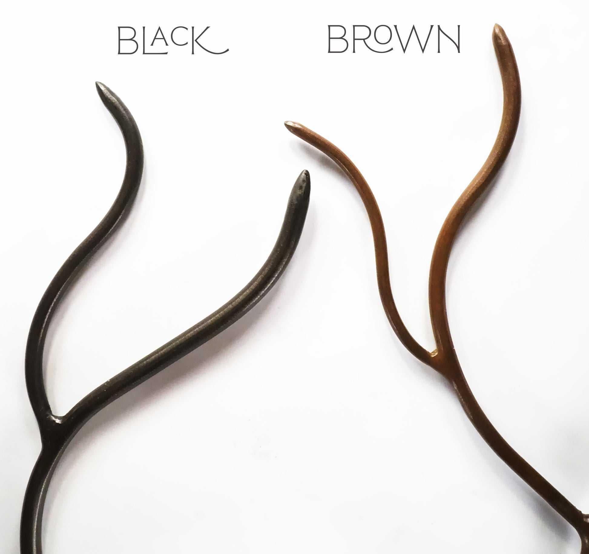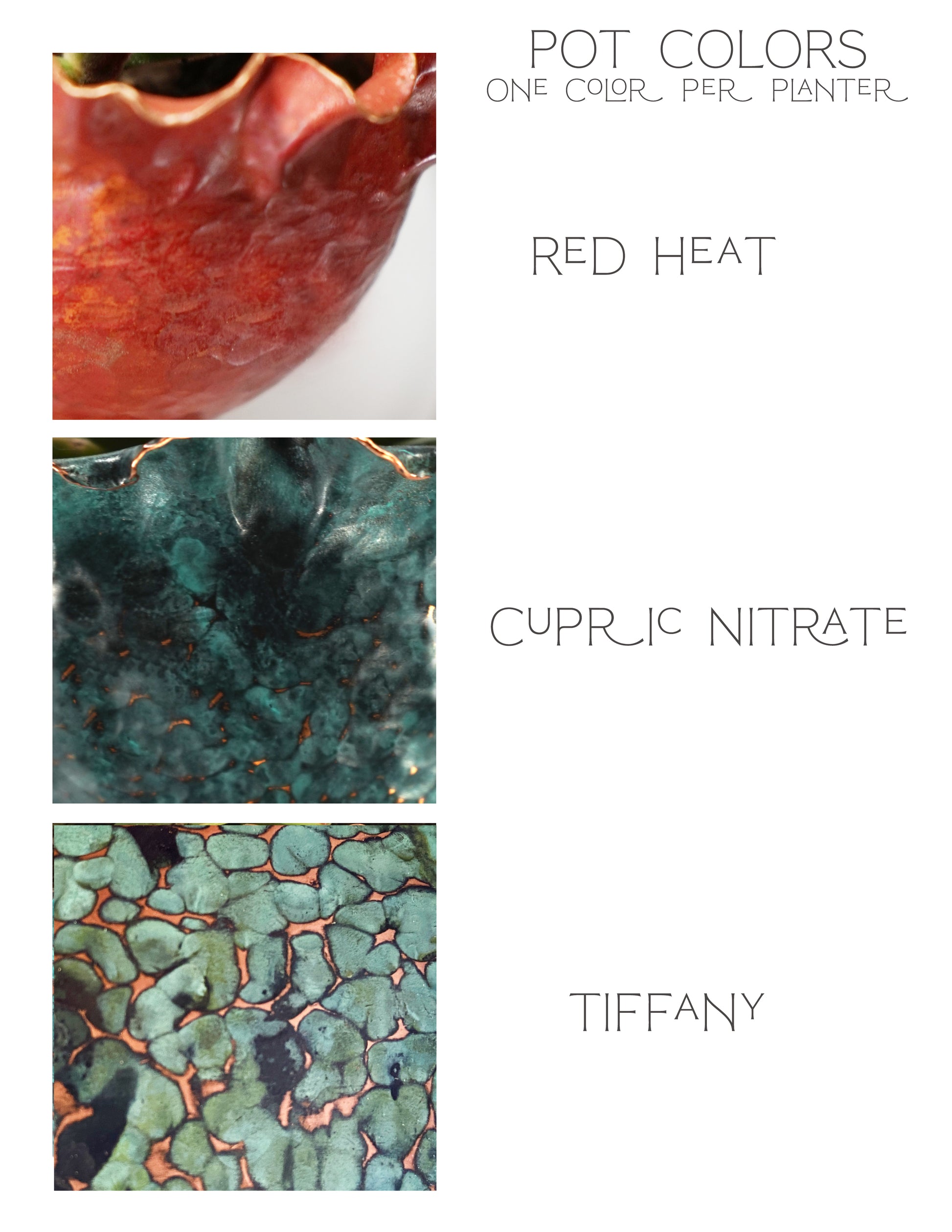 Please see Patina Colors guide image for available color options. Patinas are variable and never exactly the same twice- so your piece will look similar to the photo, but unique. "Red Heat" is especially unpredictable, and often has blacks, oranges and pinks.